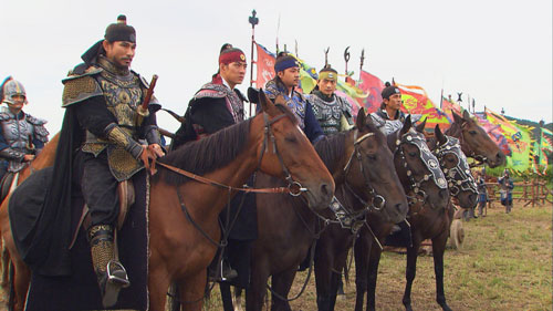 タムル軍の砦にやって来たフクチ大将軍(テジャングン)は、 チュモンに、クムワが復位を決意した事を告げ、 自分達はタムル軍ではなく四出道(サチュルト)を攻撃するつもりだと伝える。 チュモンはフクチ大将軍に、漢軍が扶余(プヨ)を攻めて来た場合、 タムル軍がそれを阻止する事を約束する。 |