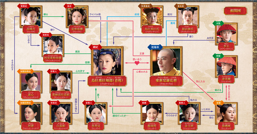 1735年、清の乾隆(けんりゅう)帝が即位すると、彼と幼い頃から愛を育んできた側室の如懿(にょい)は妃(ひ)に封じられる。だが如懿は、叔母と対立関係にあった皇太后や、皇帝の寵愛を巡る皇后、妃嬪たちの権力争いに巻き込まれるように。乾隆帝はそんな彼女を守り、如懿も持ち前の知恵を発揮し2人で支え合いながら困難を乗り越えていく。そんな中、立て続けに皇子が殺害される事件が発生! 如懿は濡れ衣を着せられて冷宮送りにされてしまうが…。次々と仕掛けられる罠と陰謀渦巻く宮中で、乾隆帝の愛に支えられ如懿はついに皇后の地位に上り詰める。しかし、そんな2人の愛にいつしか暗雲が立ち込めていき-?