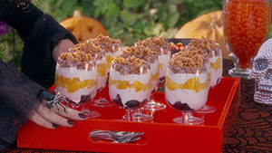 ジャーダは、楽しいお化け屋敷と、季節の色や風味を楽しめるおいしいお菓子を用意して、裏庭でハロウィンパーティーを開くことに。紹介するのは、おいしくて楽しいハロウィンのスイーツたちだ。可愛くてちょっぴり変わったチョコとオレンジのケーキポップ、スパイスを利かせたパンプキン・レーズン・クッキー、そしてブドウとマンゴーのパフェ。子どもたちが夢中になること間違いなし。