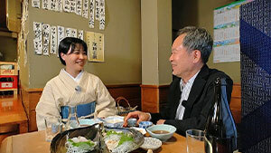 銀座通のお二人が選んだのは老舗「泰明庵」。蕎麦だけでなく、つまみが素晴らしく充実。まずはビールで乾杯。豊富なメニューから、辛味おろしに、ぎんぽ天ぷらと桜海老かき揚げ。さらに平貝とあずきはたの刺身。そこに希少な「褒紋正宗」の燗を注文。蕎麦呑みのよさは、一人でも寛げるし、少人数でも愉しめるところ。昭和が薫る銀座の名店で、お二人は盃が重なるにつれ、深まる銀座観の会話を心ゆくまで堪能しました。