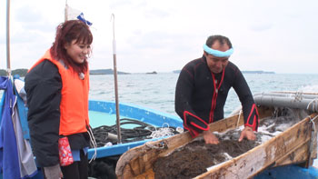 澪花ちゃんは漁船に乗って、浜比嘉島の沖合にある美ら海水産の養殖場へ。案内していただくのは地元の漁師さんの間でも信望が厚い赤嶺社長。もずく漁は、長いホースがついたポンプで海底から吸い取る漁。船上へ吸い上げられる、およそ2~3トンにも及ぶもずくは迫力満点!
