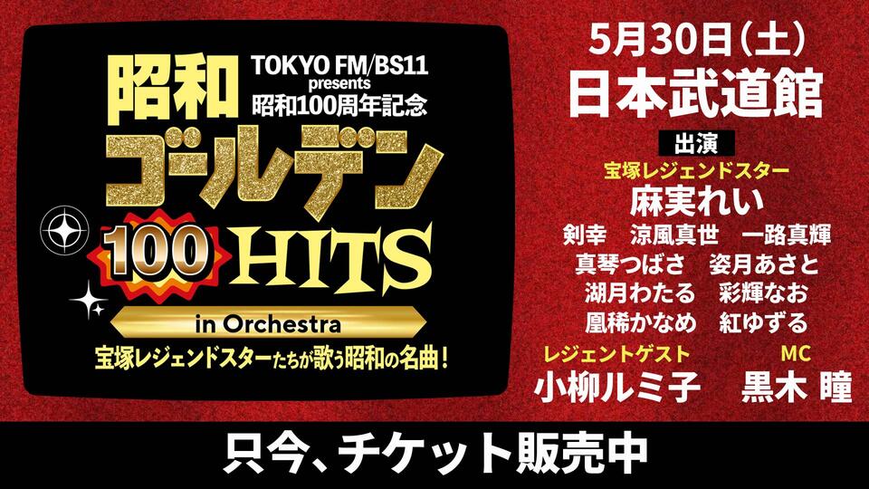NEW 【出演者第2弾発表】MCに黒木瞳が登場!宝塚レジェンドスター 凰稀かなめ 紅ゆずる 出演決定!昭和100年を彩った名曲100選発表&リクエスト募集開始!『TOKYO FM/BS11 presents 昭和100周年記念 昭和ゴールデンHITS 100 in Orchestra ~宝塚レジェンドスターたちが歌う昭和の名曲!~』
