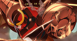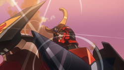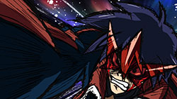 アンチスパイラルの罠を突き破り、ついに変形を完成させ大銀河に立ち上がる超銀河グレンラガン!