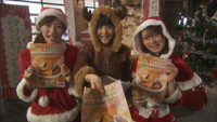 クリスマスが近づき、サンタ姿で龍王満席のチラシ配りをしている3姉妹。