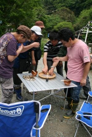 制作スタッフが釣れたにじますと手打ちうどんを食べています。