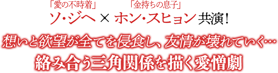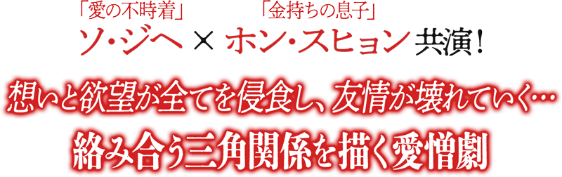 数多くのドラマに出演、『愛の不時着』で注目を浴び、その後も『夕食、一緒に食べませんか?』で主演を務めるなど、活躍し続けるソ・ジヘの主演作! ソ・ジヘは親友の夫を愛してしまう、貧しい家庭で育った女性ウンガンを迫力ある演技で好演。そして、ウンガンの親友で裕福な家庭で育ったパダを『金持ちの息子』『警察授業』のホン・スヒョンが演じ、パダの夫であり医者であるチャウォンを『一緒に暮らしませんか?』『真心が届く ~僕とスターのオフィス・ラブ!?~』のイ・サンウが演じている。ベテラン俳優たちの濃密な演技で描かれた、友情と欲望が絡み合う三角関係に引き込まれていく。