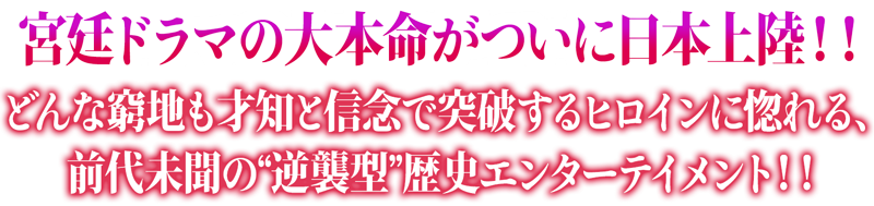 配信がスタートするやいなや瞬く間に口コミで人気が広がり、一大ブームを巻き起こしたメガヒットドラマがついに日本上陸! ドラマ部門デイリー再生数20日間連続1位、総再生数180億回を突破する歴史的記録を打ち立て、神劇(神のようなドラマ)・爽劇(史上最も爽快なドラマ)とまで称される話題作となり、中国版エミー賞と言われる国劇盛典の4冠にも輝いた! あまりの盛り上がりに、華美な描写や欲望渦巻く宮廷闘争が社会主義的価値観に悪影響を及ぼすとして、中国当局の批判を受け、テレビ放送が中止に追い込まれるという異例の事態に発展したほど!従来の時代劇の枠を超えた痛快さだと大反響を呼び、“やられたらやり返す”不屈のヒロイン像は女性版“半沢直樹”と評された。二転三転するミステリーの行方、一筋縄ではいかない三角関係の恋愛など、ドラマチックな展開から一瞬たりとも目が離せない!