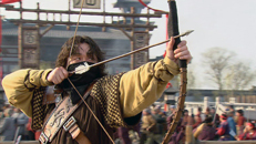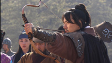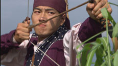 クムワ王は三人の王子を呼び、武芸対決を行わせる。 武芸でチュモンに負けるはずは無いと自信満々のテソとヨンポは、 弓の対決で矢を次々と的に命中させる。 しかし、チュモンは自分の番になると目隠しをして・・・。 |