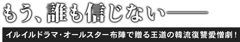 近年のイルイルドラマを語るには欠かせない演技派女優パク・ハナと、数々のメロドラマで女性を魅了してきたコ・セウォン、2人の共演が遂に実現。その他にも、18年のイルイルドラマ「運命の渦」「明日も晴れ」でお目見えしたカン・ソンミンやイ・チャンウクが主要キャストを務め、脇役に至るまでイルイルドラマ常連組が総出演。オールスター布陣によるクオリティ保証付きの、韓流復讐愛憎劇最新作!