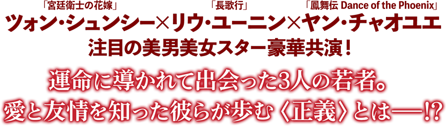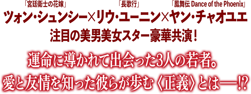 「擇天記(たくてんき)~宿命の美少年~」で大ブレイクし、「宮廷衛士の花嫁」でのイケメン衛士役でさらに人気を高めたツォン・シュンシーが、英雄に憧れる心優しき武侠を熱演! 正義のために剣を振るう正統派ヒーローを見事に演じ切り、本作で新たな魅力を開花させた。そんな彼と契りを交わす腕利きの剣客に扮するのは、リウ・ユーニン! 大ヒット作のOSTへの参加で歌手として注目を集め、「長歌行」でのブレイクで俳優としても躍進した彼が、ニヒルで飄々とした態度と不器用な優しさのギャップで視聴者を魅了! さらに、「鳳舞伝 Dance of the Phoenix」をはじめ幅広い作品で活躍し、スター女優への地位を確立したヤン・チャオユエが、2人と友情を結ぶ侠客見習いのお嬢様を好演! ツォン・シュンシーに対して素直になれない愛らしいツンデレ女子ぶりで見る者を惹きつける!