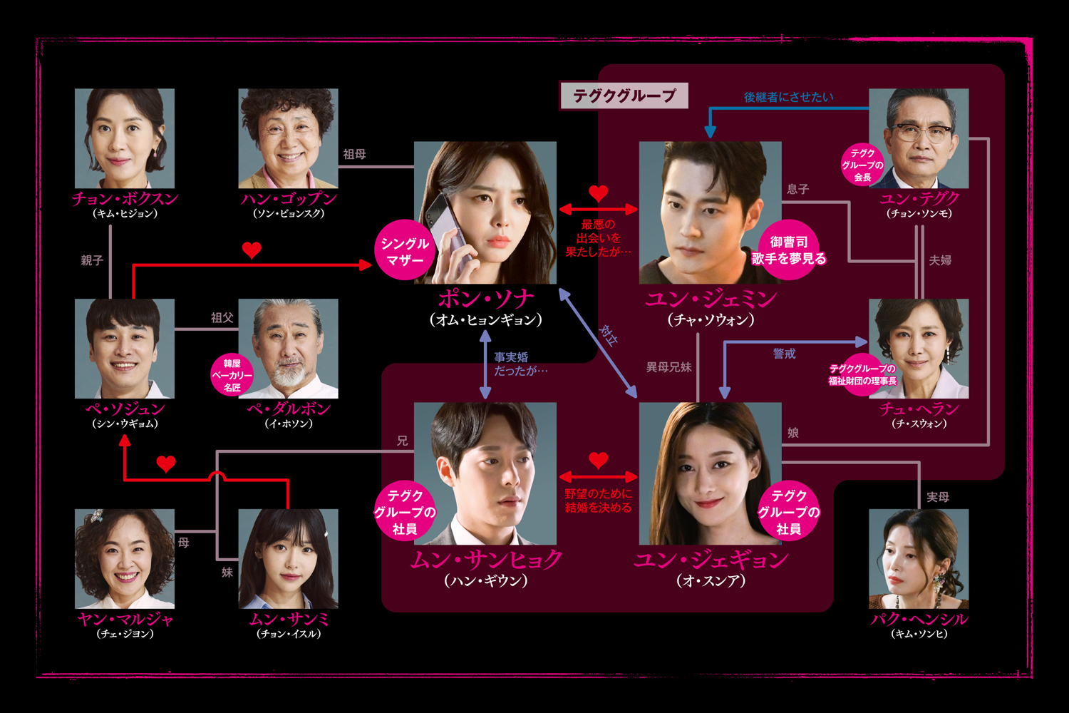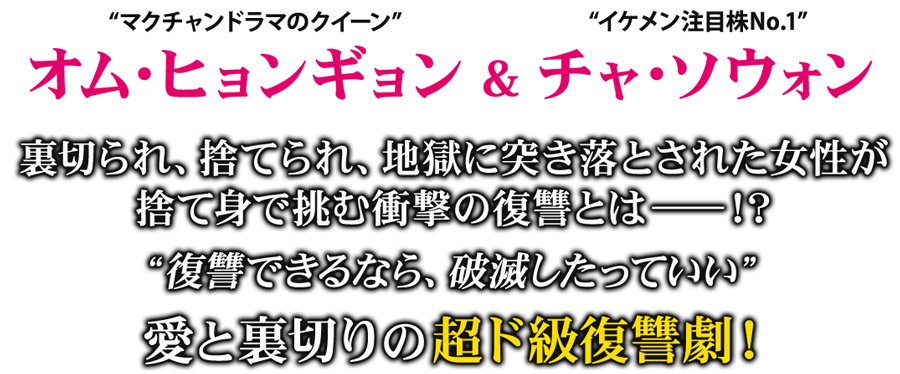 ヒロインを演じるのは、復讐劇のヒット作でお馴染みのオム・ヒョンギョン。愛らしい女性から魔性の女に変身し、一人二役で別人の仮面をかぶって復讐相手を翻弄する! 彼女を支える心優しい青年を演じるのは、「ファイティン♡ガール~Miss Lee~」以来オム・ヒョンギョンとは2度目の共演となるチャ・ソウォン。ミュージカルで活躍する彼は、ドラマのOSTも歌っている。本作での2人の熱演は高い評価を受け、MBC演技大賞<毎日ドラマ部門>でそれぞれ最優秀演技賞をダブル受賞という快挙を達成! その他、「悪い愛」オ・スンア、「白夜姫」ハン・ギウンをはじめ、若手からベテランまで愛憎復讐ドラマの王道キャストが勢揃い! 予測不能な激情ロマンスから目が離せない!