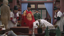 第8話「チェ・ヘサン拉致事件」 世子は忠寧大君を相手にせず、即位を狙っているのではないかと怪しむ発言をする。 ある日、軍器監少監チェ・ヘサンが拉致されてしまい、忠寧大君は軍事情報を盗むためではないかと主張するが、 世子と叔父に証拠不十分として拒否される。 忠寧大君はオク・ファンを訪ねチェ・ヘサンが役人の恰好をした倭人によって拉致されたことを突き止めるが、 結局、世子の手柄として倭人は捕えられる。 |