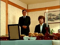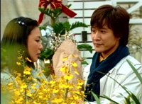 花束を手にそしらぬ顔でやってきたジス(シム・ヘジン)を見て仰天する妻のセジョン(オ・ユナ)。