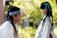 ムヒュルはヨンを城に呼び、高句麗〔コグリョ〕の王子であるという運命を受け入れたと告げる。自分が扶余〔プヨ〕の姫と知れたら危険だと案じるヨンに、ムヒュルは自分が守ると言い、ヨンは宮廷医師として招かれる。ユリ王はムヒュルに沸流〔ピリュ〕からの税金の取り立てを命じる。ムヒュルは沸流が独占する貿易権を取引に持ち出し、交渉の才を見せる。そんな中、扶余から和解を求めて使者が訪れ、ムヒュルが扶余に向かう。 |