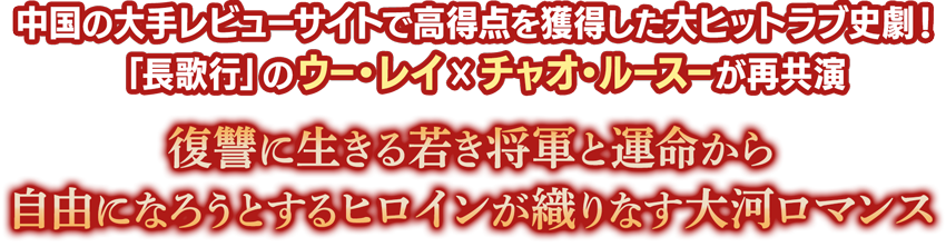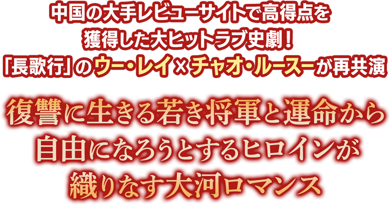 主演は、人気作「長歌行」でも共演しているウー・レイとチャオ・ルースー。子役時代から活躍しているウー・レイが、本作では家族の復讐を胸に秘めた若き将軍を演じている。相手役は、くるくると変わる表情で、“華流ラブコメの女王”として確固たる地位を築いているチャオ・ルースー。本作では、聡明で、自分の道は自分で切り開く、凛とした強さを持つヒロインを演じ、新たな魅力を開花させた。