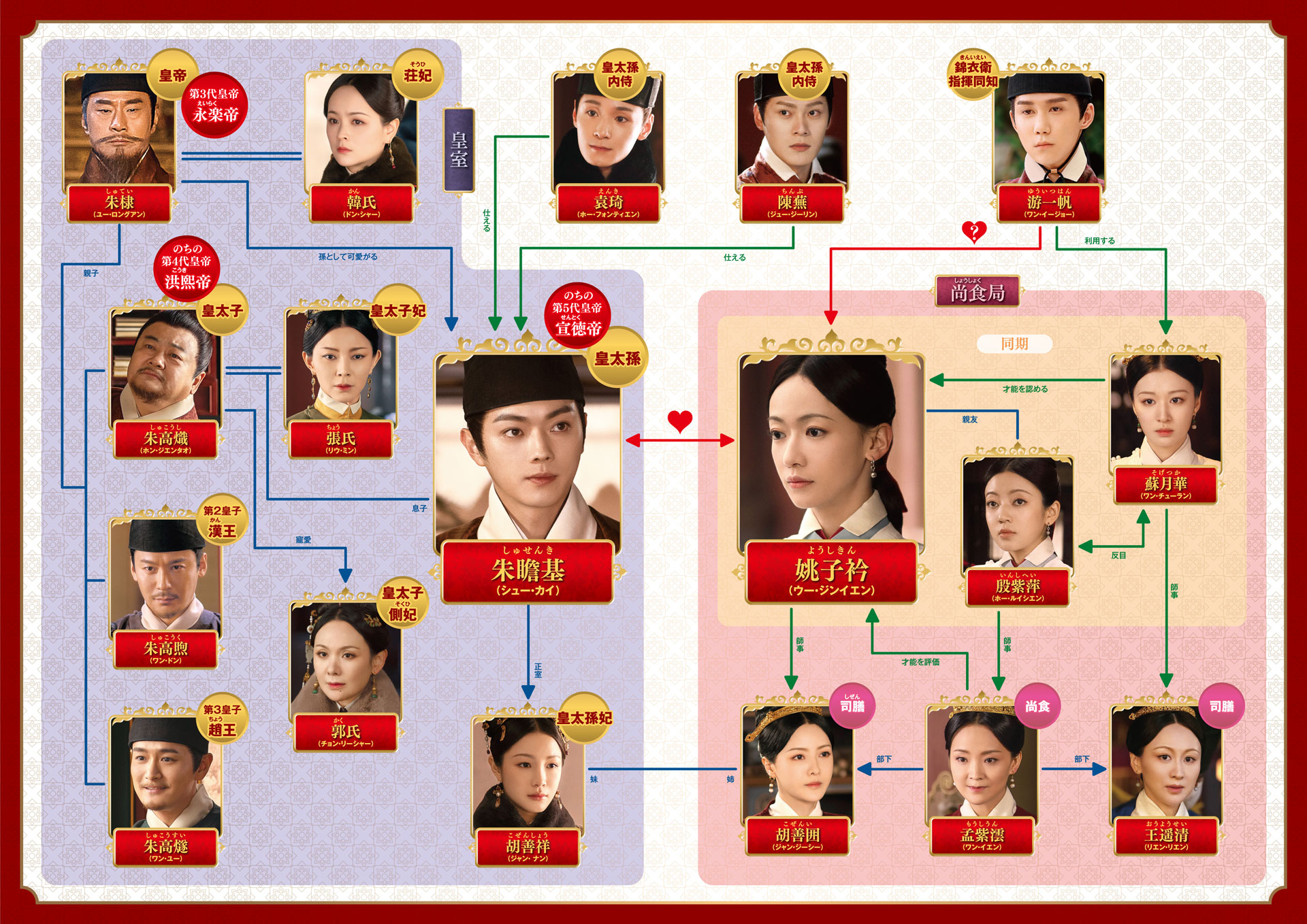 本作は、皇太孫と女官という身分違いの2人の甘酸っぱいロマンスに加え、野望渦巻く宮中の権力闘争や、尚食局の女官同士の嫉妬や友情などの人間模様も見どころ。そんな中、妃たちにも勝る才能と優れた機転を発揮し出世していく姚子衿のサクセスストーリーが爽快! 明の全盛期を築いた宣徳帝と彼に寵愛された女傑・孝恭章(こうきょうしょう)皇后という実在の人物の若かりし頃をモデルに、史実とフィクションを織り交ぜることでよりドラマティックな極上のエンターテイメントが完成!