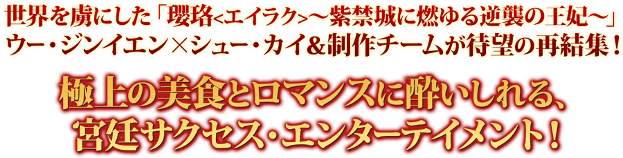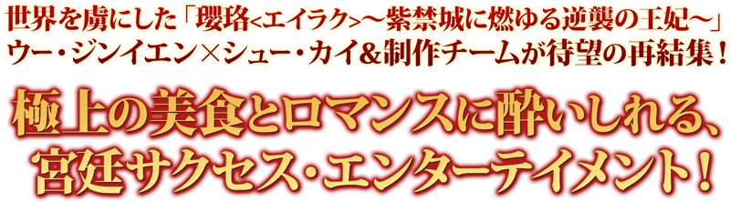 また、「瓔珞」を世界的ヒットに導いた名プロデューサー、ユー・ジョンと、脚本、美術、衣装の制作チームが再結集したことも話題となった本作。監督とクリエイターチームは数カ月にわたり時代考証を行い、セットの紫禁城の壁を3カ月という時間を費やして再塗装。衣装も80名を超えるスタッフが手作りで制作し、リアルさを追求! さらに、中国トップクラスの監修者と選りすぐりの料理人、合わせて15名が現場に常駐し、1000を超える美食の数々をすべて本物で再現。それだけでなく、料理を盛る器は「磁都」と称される陶磁器の有名な生産地・景徳鎮や山西の工芸廠に特注した一級品を使用するなど、他に類を見ないクオリティで明朝の宮廷と食を現代に蘇らせた!