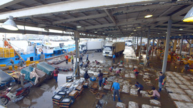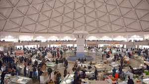 市場の商業ゾーンは2キロメートルあり、1日に約10,000人のバイヤーが訪れる巨大市場。 夜明けと同時に約500人の売り手が店を開け、様々な形と色の魚、カニ、タコ、ムール貝、甲殻類、生きたまま焼き上げると美味しいウナギなどが店頭に並びます。 新しくなった大きな市場の建物はカモメが羽根を広げたような大胆な建築様式ですが、何十年も市場で商売をしている人々は気にもしていないようで明るく元気に働いている。