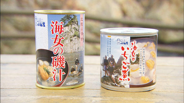 お吸い物、炊き込みごはんにも。小袖浜で海女達が直接獲った旬のウニと久慈産のアワビを原料に、素材の風味をそのまま、お吸い物の缶詰にした久慈の磯の香りが味わえる特別限定製品。ホタテの入った「海女の磯汁」もおすすめです。