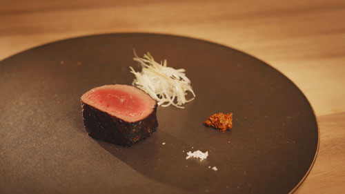 旅のメインは、青々とした田んぼが続く里山の真ん中にぽつんとたたずむレストラン「mûrir(ミュリール)」。そこで供されるのは特産である米を主体にし、フレンチの技法を用いた薪焼きのコース料理です。