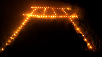 盆に帰ってきた祖先をあの世に送り返すための宗教行事で、京都の市街地を囲む「大」「妙法」「船形」「左大文字」「鳥居形」の五つの山に地元保存会の人びとの手によって火が灯されます。