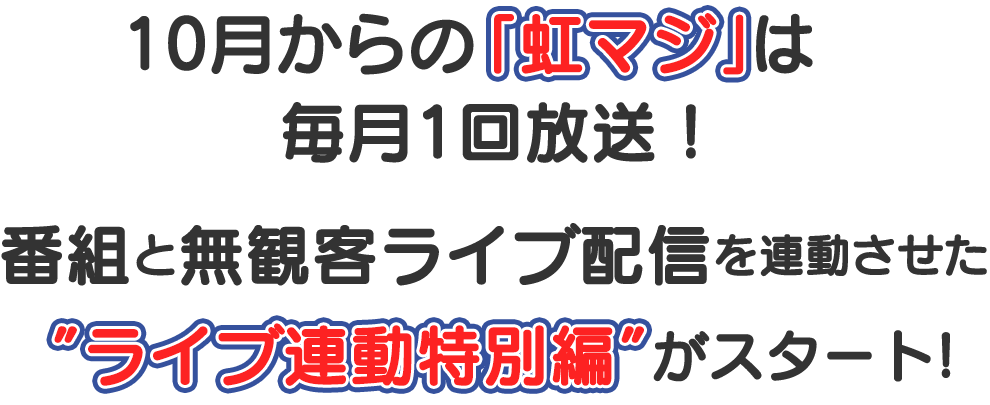 虹コンメンバーがさらにマジになって、様々な企画に体当たりでチャレンジ。今まで以上に笑いや涙に溢れたハイスピードな番組へと進化します。