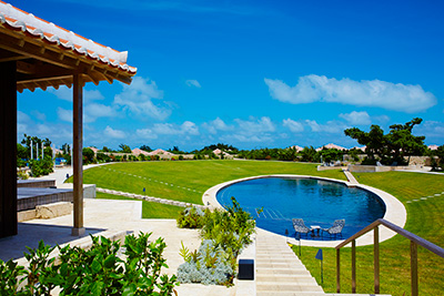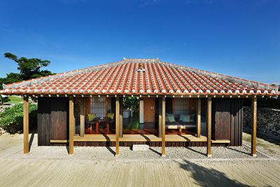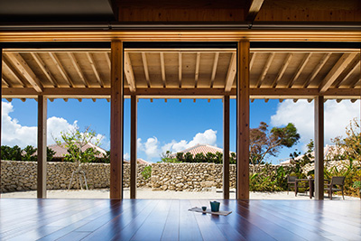 そして周囲に目を向ければサンゴで作られた石垣とその奥には赤瓦の三角屋根...