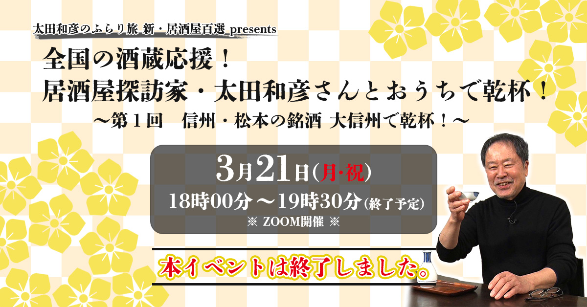 初回となる今回は、太田和彦さんの出身地、信州・松本の地酒「大信州」で乾杯します 。松本の自然・風土・歴史や郷土料理の酒の肴など太田さんが語る90分。参加者からの質問コーナーでは、普段番組では聞けない話が太田さんから聞けるかも?さらに、大信州酒造の蔵元も参加。入手困難なグッズを提供いただき、大抽選会も実施予定です。