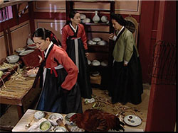 その結果食材を失ったハン尚宮(サングン)は、再度の準備をチャングムに頼み、足りない食材を入手するため、宮中を出る。その道中でハン尚宮(サングン)の乗った船が不審な航路を取る。