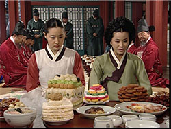 その後、巻き返したチャングムとチェ尚宮(サングン)の対決は、食後のお菓子で勝敗が決まることに。皇太后は最後の一品を前に、今日の課題「最高の料理」はどれかと両者に質問。チェ尚宮(サングン)は絶賛されたヨンジョ(イノシシ肉の煮込み)を挙げ、チャングムはこれから出すお菓子がそれだといい、最後の一品を出す。