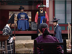 海賊のかしらに施療したことから、謀反の罪に問われ義禁府(ウィグムブ)に連行されたチャングム。チェジュドの長ハン・ドンイクは宮廷に、奴婢が海賊と通じていたため敢えて後退し、隙を見て反撃したと報告。チャングムは裏切り者として取調べを受ける。同行していたチョンホが報告書の虚偽を暴くも、ハン・ドンイクはオ・ギョモの後ろ盾を得ており、チャングムが敵の大将を治療した事実は否めない。真相は宮中にひそかに広まり、医女たちは「チェジュドの女」の行為に関心を持つ。医女としてどう行動すべきか、考えあぐねる医女たちは、后にその話をする。