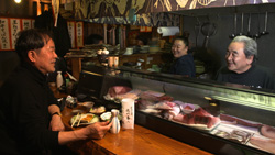 そして、お目当ての居酒屋巡りへ。一軒目は、創業33年、地元の野菜、魚、名物のイカにこだわる活魚料理「山茂」で、地酒「太閤」とともに新鮮なイカの活造りを味わいます。続いては、 十数年前に酒屋の倉庫を改築して開いた居酒屋「大八車」で、豆アジ刺身や唐津産板うにと地酒「万齢」を堪能します。
