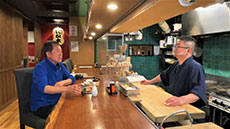 一軒目は、鮮魚が自慢の家族で営む居酒屋「呑喜(のんき)」。毎朝市場から仕入れる魚介の数々には定評があります。まずは府中誉が醸す「渡舟」の燗酒から。特大の岩がきにメバルの姿造り、どれも目を見張る逸品揃いに太田さんも大満足。