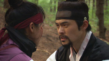 チャン頭領が手にしている剣と「発墨」の文字に、もしや兄ではという淡い期待を抱くチェオク。追っ手の銃弾を肩に受けてしまった。その報告をイ武将から受けたユンは、一味の山塞がある逍遙山に馬を走らせた。チェオクは、ソンベクが部下に托した密書を奪い取るが、ソンベク腹心の女性スミョンに襲われ、あわやのところをユンに救われる。密書の宛先は訓練都監のチョン大将で、彼の自宅の寝室の壁から私鋳銭の原版が発見された。