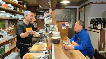 お目当ての居酒屋、燗酒の店「サケとサカナ ヒナタ」。酒肴に定評のある地元の人気店です。まずは島根産「扶桑鶴 特別純米」の燗で。米の旨みを醸した濃い酒です。お通しは、イタドリのクミン炒めなど8種の盛り合わせ。熟成ナイラゲ漬けは、1か月熟成させた、まるで上質のハムのような逸品。そこに本日獲れたてのカツオを炙った、カツオ焼切りが登場。寡黙の中にセンスの光るアテの数々に、太田さんも心地よく酔いしれました。