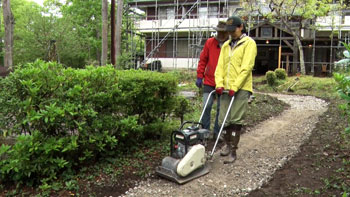お庭の小道の下地をなんとかおわった黒谷さん!次はここに大量の砕石を流し込む作業。流し込んでは叩いて固めていく地道な作業の連続です。おっと雨が激しくなりそう。さぁスタッフも一緒にがんばりましょう!