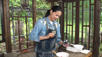今回は、バラを幅広く楽しむため京成バラ園に併設されたカフェに。バラを使ったソフトクリームや香り高いローズヒップティーを堪能。お庭のつるバラアーチを眺めながら黒谷さんが挑戦するのは、ばらの風味をビネガーに移して作るドレッシング。