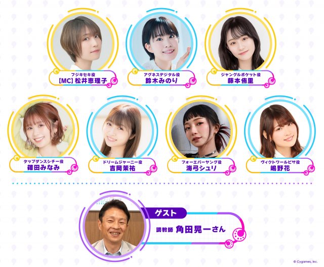 【MC】松井恵理子(フジキセキ役)、鈴木みのり(アグネスデジタル役)、藤本侑里(ジャングルポケット役)、篠田みなみ(タップダンスシチー役)、吉岡茉祐(ドリームジャーニー役)、海弓シュリ(フォーエバーヤング役)、嶋野花(ヴィクトワールピサ役)、【ゲスト】角田晃一(調教師)