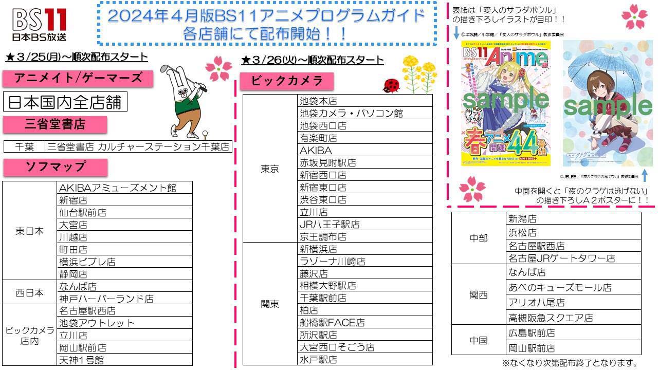 恒例の『BS11アニメプログラムガイド』を、24年4月クールも全国のビックカメラ各店舗、アニメイト日本国内全店舗で配布いたします。