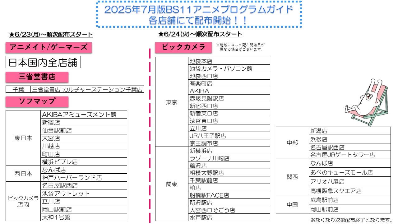 全国のビックカメラ全店舗、アニメイト日本国内全店舗ほかにて、2025年7月クールのアニメを網羅した「BS11アニメプログラムガイド」を配布いたします。