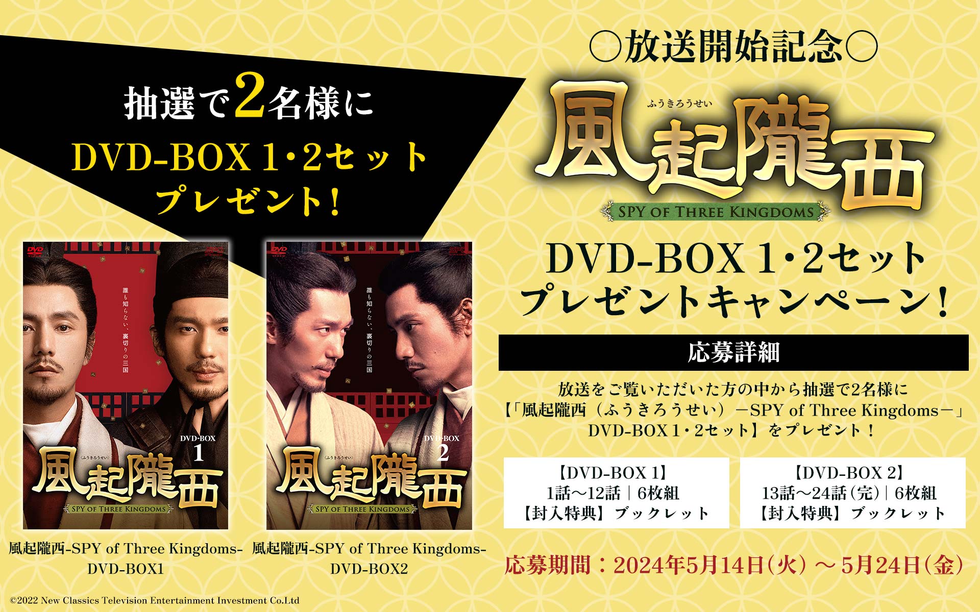 中国時代劇『風起隴西(ふうきろうせい)-SPY of Three Kingdoms-』の放送開始を記念して、放送をご覧いただいた方の中から抽選で2名様に【「風起隴西(ふうきろうせい)-SPY of Three Kingdoms-」DVD-BOX1・2セット】をプレゼントするキャンペーンを実施します。 【プレゼントキャンペーン詳細】 【賞品】 「風起隴西(ふうきろうせい)-SPY of Three...