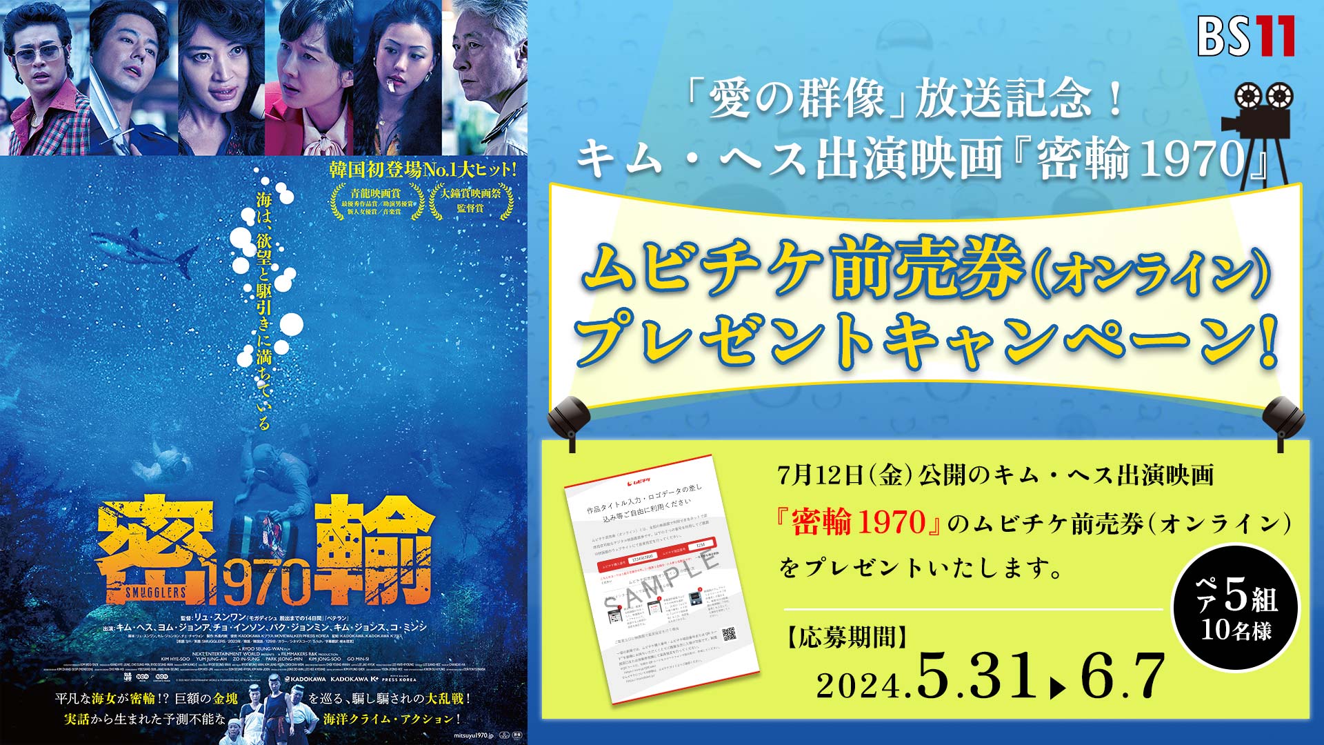 韓国ドラマ「愛の群像」(出演:ぺ・ヨンジュン、キム・ヘス、ユン・ソナ 他)の放送を記念して、放送をご覧いただいた方の中から抽選で5組10名様に、7月12日(金)公開のキム・ヘス出演映画 『密輸 1970』のムビチケ前売券(オンライン)をプレゼントいたします。