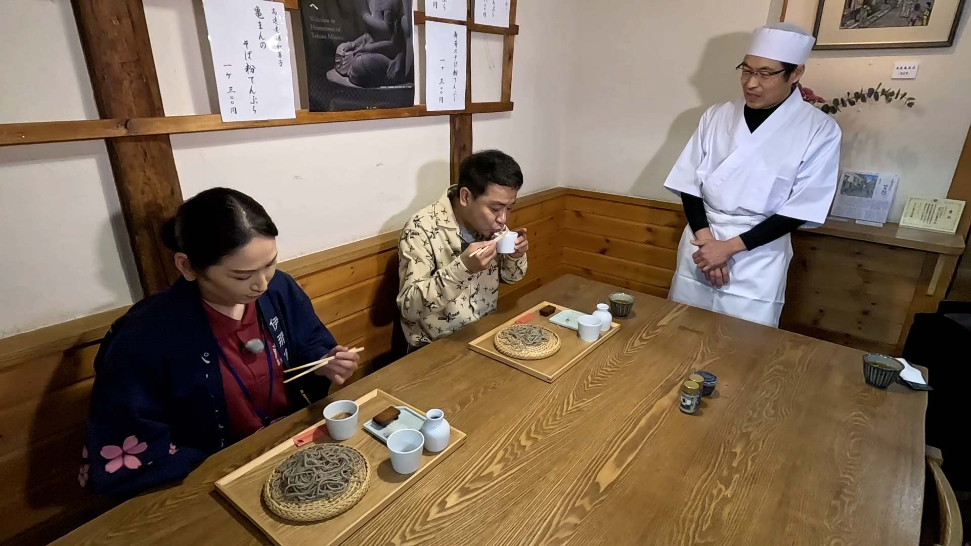 「高遠そば」を味わうために観光協会の方オススメのお店"壱刻"へ。店主は20年前に食べた「高遠そば」に惚れて、神戸から移住してきたとか。中山さんは、焼き味噌と高遠辛味大根の絞り汁が決め手という「高遠そば」を人生で初めていただきます。