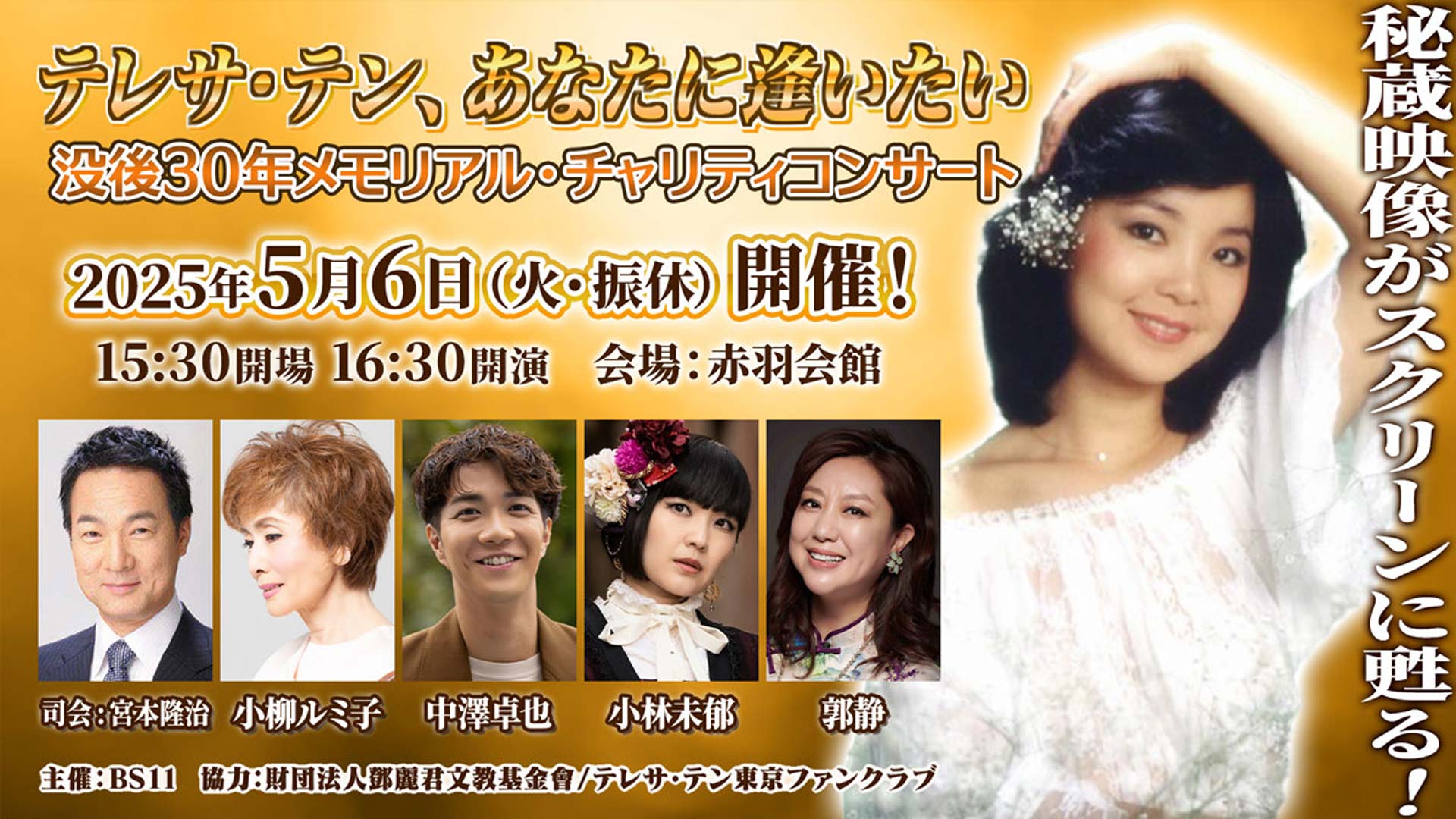 BS11は、アジアの歌姫テレサ・テンが、2025年5月8日に没後30年を迎えるにあたり、既報の通り、5月6日(火・振休)に『「テレサ・テン、あなたに逢いたい」没後30年メモリアル・チャリティコンサート』を実施いたします。